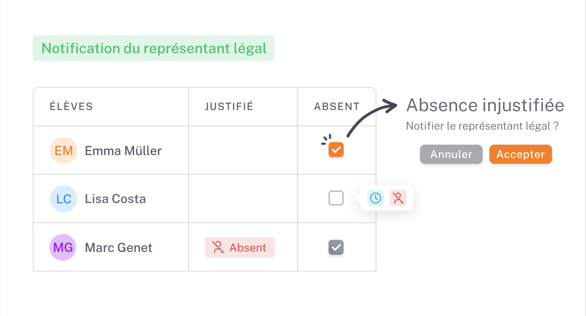 Optimisez le suivi des présences avec une interface qui facilite la déclaration des retards et absences par les élèves. Les enseignants sont alertés en temps réel, améliorant la communication. Les notifications personnalisées aux représentants légaux assurent sécurité et sérénité.