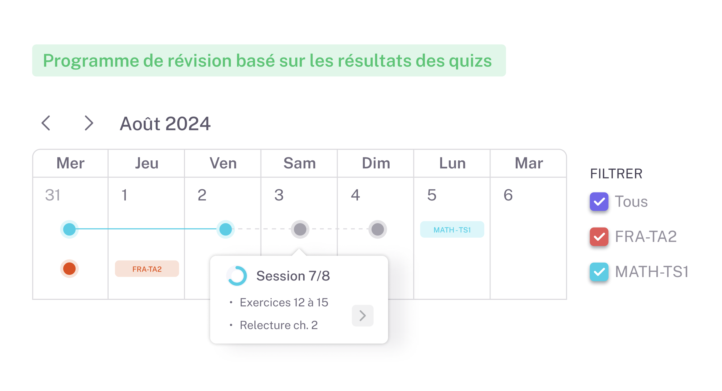 Démarrez la préparation aux examens avec des plans de révision personnalisés, générés sur la base des lacunes identifiées, assurant une approche sur-mesure et efficace. Simple et directe, cette fonctionnalité propulse les performances des étudiants et place votre établissement à l'avant-garde pédagogique.