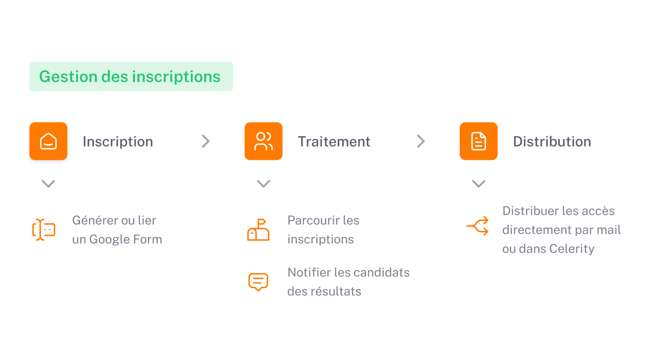 Simplifiez la gestion des inscriptions et optimisez l'organisation scolaire. Créez ou intégrez des formulaires Google Form pour recueillir les candidatures efficacement puis gérez facilement les admissions directement dans la solution. Automatisez la distribution des informations et des accès dès la confirmation de l'inscription, garantissant un gain de temps précieux.